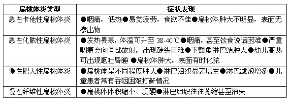 扁桃体发炎可以分为急性卡他性扁桃体炎、急性化脓性扁桃体炎、慢性肥大性扁桃体炎和慢性纤维性扁桃体炎几种。根据类型的不同,症状上也有所区别。