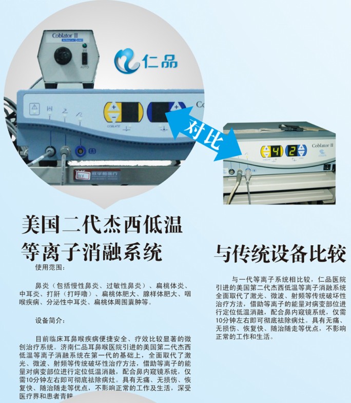 ★配套诊疗“装备”精良: 日本Olympus纤维鼻咽喉镜、德国WOLF鼻内窥镜、飞利浦双层螺旋CT机、德国WOLF支撑喉镜、德国WOLF耳科显微镜、德国WOLF喉科显微镜、血球计数仪、Hp呼吸测 试仪、全自动血细胞分析仪、全自动生化分析仪、血凝仪、酶标仪、细菌培养室、药敏试验室等百余种现代化医疗设施。